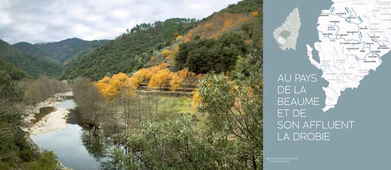 Cette Ardèche cévenole dévale entre le plateau ardéchois et le bas Vivarais calcaire. Terre de châtaigniers, de vignobles, d’oliviers… s’étageant en « faïsses », parcourue de ruisseaux capricieux, de béalières d’irrigation, de troupeaux de chèvres et de moutons, empreinte d’une histoire passionnée qui se révèle au fil des balades dans des paysages préservés…