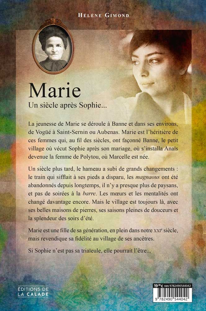 Ouvrage de terroir, histoire de Marie, une femme du XXIe siècle, en Ardèche, et qui revendique sa fidélité au village de ses ancêtres. Une continuation à la célèbre trilogie d’Hélène Gimond.