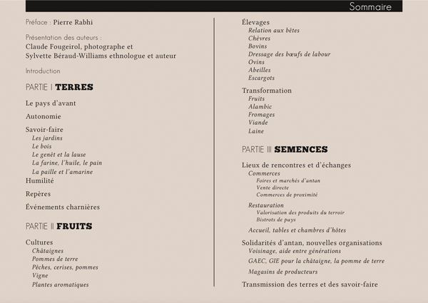 «Depuis des décennies nous cultivons le même espace. Claude Fougeirol au contact généreux, apprivoisant même les plus farouches, capte l’image et la lumière des visages, objets, gestes et paysages confondus. Je collecte les voix, les mémoires des travaux et des jours, les histoires de vies et les pratiques. Nous avions souvent évoqué l’envie de travailler ensemble. Notre commun attachement à la vie traditionnelle nous orientait principalement vers les « anciens », paysans pour la plupart, ces hommes et ces femmes marqués sur le visage et dans leur corps par une vie au service d’un lopin de terre agrippé aux pentes de l’Eyrieux ou plaqué dans la solitude du plateau ardéchois. /…/ Plus qu’une simple balade en Ardèche ou la restitution du parcours de deux auteurs, ce livre a l’ambition de faire partager au travers d’un kaléidoscope de quelques soixante et dix rencontres, des savoir-faire, des expériences s’inspirant parfois de celles des anciens, mais aussi des instants et parcours de vie qui évoquent, à petites touches, l’évolution de ce pays, et les infinies ressources d’ingéniosité, de persévérance et d’imagination de ceux qui l’ont vécu ou qui le réinventent actuellement. Un ouvrage où le lecteur, selon son envie, pourra composer son propre cheminement et saisir, au gré des images et des textes en miroir ou complémentaires, la petite note optimiste d’un rural en pleine mutation. »